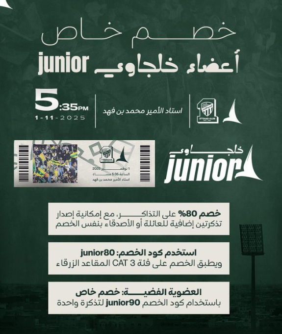 نقدّم لأعضاء برنامج «خلجاوي Junior» خصمًا خاصًا لحضور مباراة فريقنا الأول أمام نادي الاتحاد، يوم السبت 1 نوفمبر 2025 عند الساعة 5:35 مساءً على ملعب استاد الأمير محمد بن فهد.