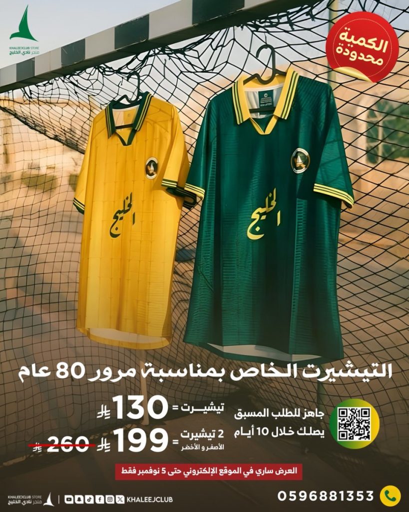 وطرح النادي التيشيرت بعدد محدود عبر متجر الخليج الإلكتروني، بسعر 130 ريالًا للطلب المسبق، أو 199 ريالًا عند شراء قطعتين.