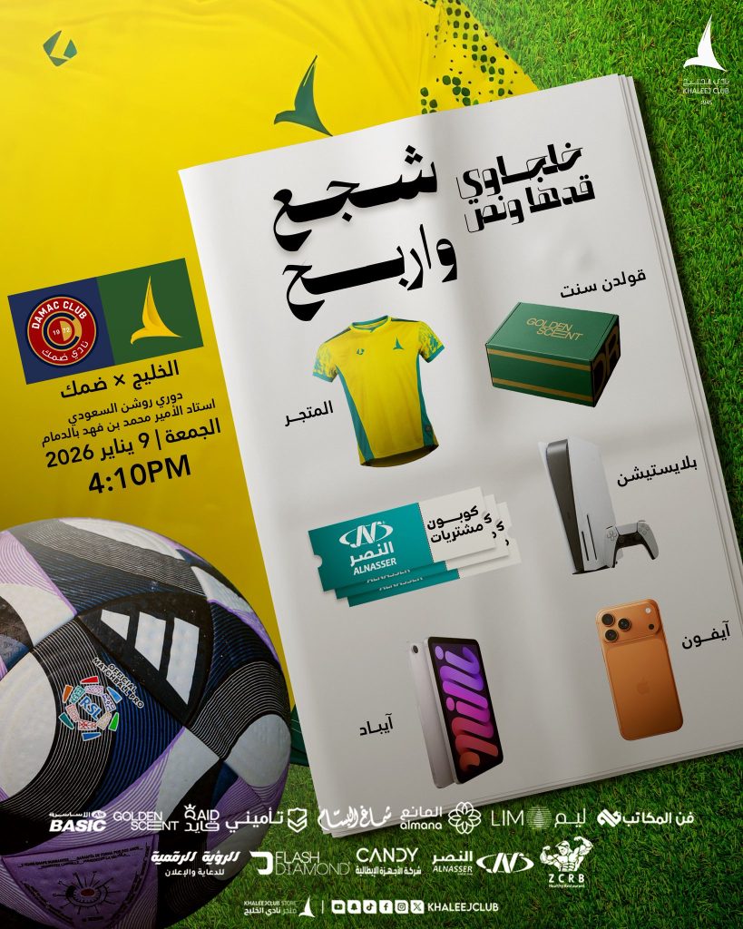 عصر الجمعة موعدنـا 🗓️جوائـزنا تنتظركـم 🎁🤩 rawan ahmed 09/01/2026 أخبار النادي خلجاوي قدهاونص 💚💛 #تحدي_العوائل | #الخليج_ضمك 🌇 Continue Reading Previous Post✨جيل من بعد جيل، وهذا المدرج يعرفناNext Postتــركــيـز عـــالـي 🔝