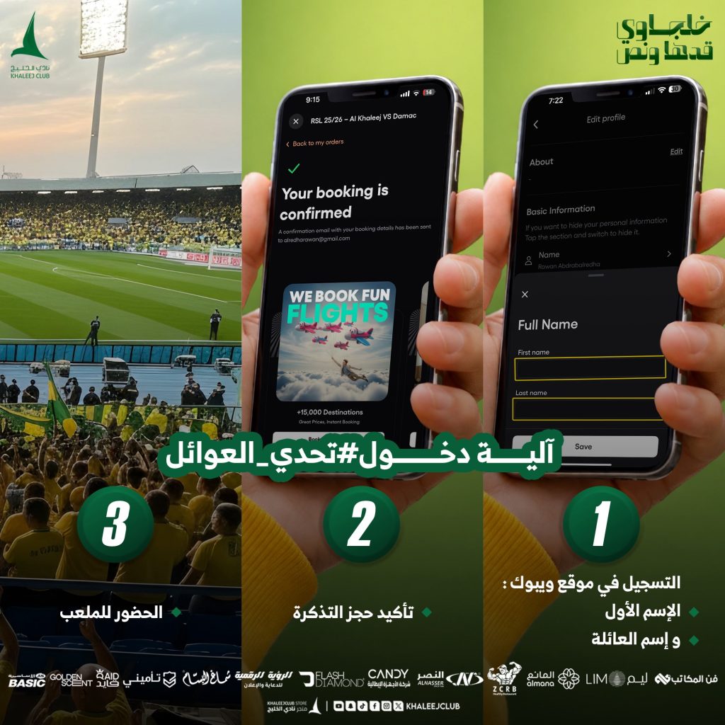 وجودكم في المدرج… يكمّل الأجـواء 🫶🏻 rawan ahmed 09/01/2026 أخبار النادي سجّل بياناتك، أكّد الحجز، وتعالوا شاركونا اللحظة 🏟️#تحدي_العوائل | #الخليج_ضمك 🌇 Continue Reading Previous Postتحديات ومسابقات في منطقة الفعاليات 💪🏼🥅Next Postحافلات متوفرة لنـقل الجماهـير 🚌