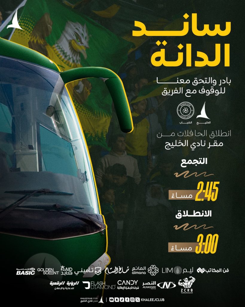 حافلات نقل الجماهير | مواجهة الخليج x الشباب rawan ahmed 23/01/2026 أخبار النادي Continue Reading Previous Postتوقع واربح | الخليج x الشبابNext Postمسابقة تحدي المهارات | الخليج x الشباب