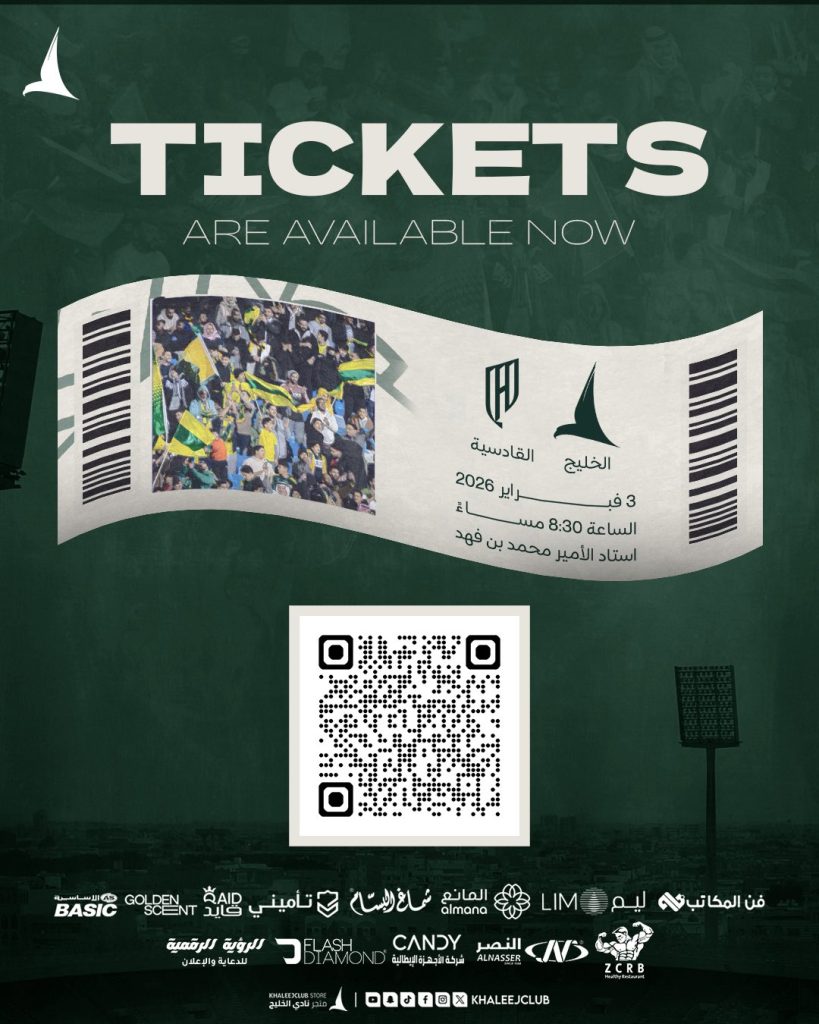 تذاكر لقاء #الخليج_القادسية متاحة الآن rawan ahmed 01/02/2026 أخبار النادي Continue Reading Previous Postمباراتنا القادمة أمام الشباب .. وبانتظار جمهورنا للمساندة