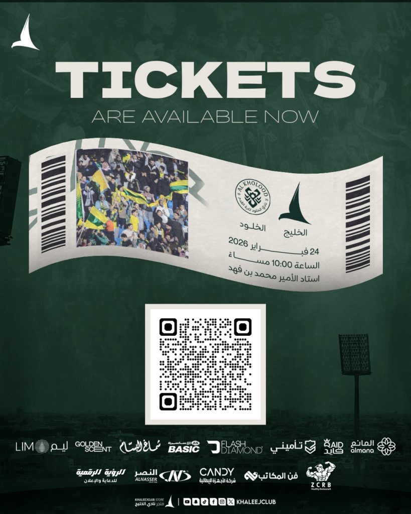 تذاكر لقاء الخليج والخلود rawan ahmed 24/02/2026 أخبار النادي Continue Reading Previous Postفعاليات جولة #يوم_التأسيس | الخليج ونيومNext Postهدايا مقدمة من وزارة الرياضة في لقاء الخليج والخلود
