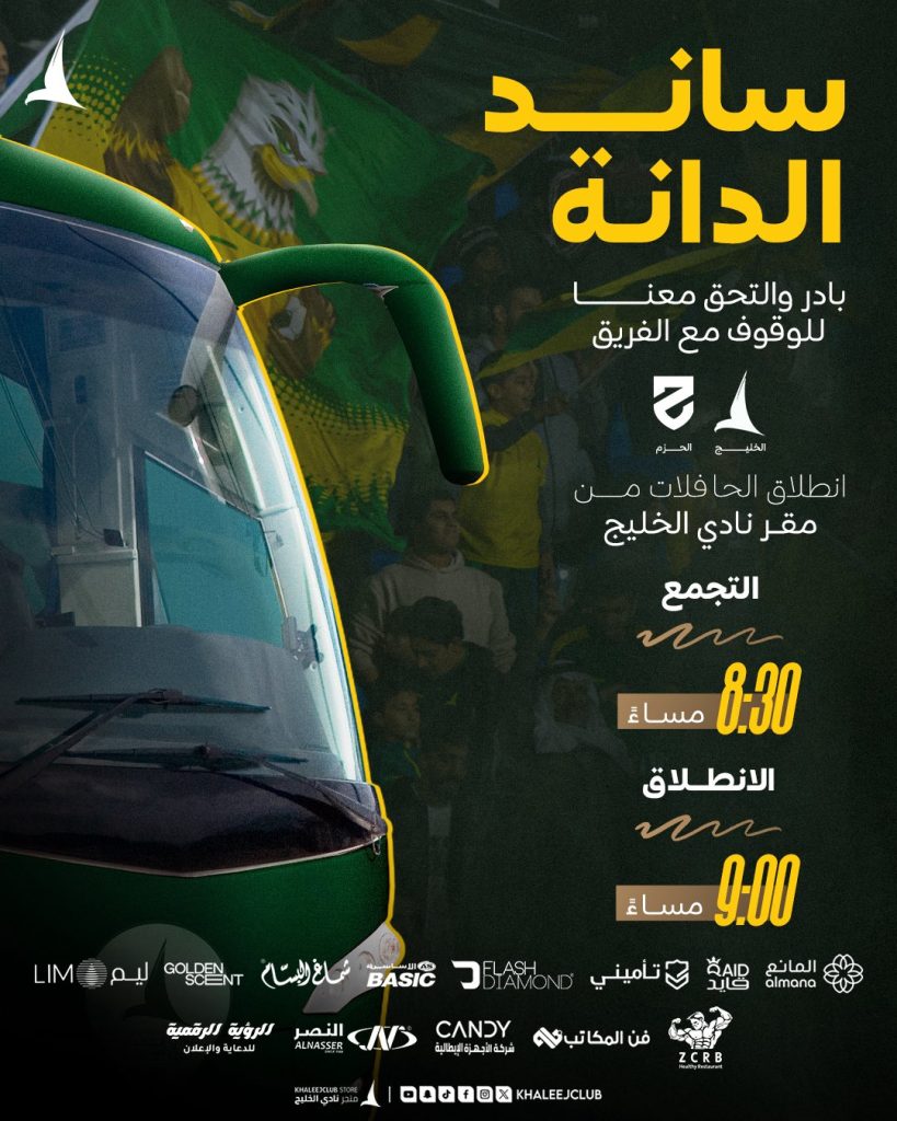 حافلات نقل الجماهير | الخليج والحزم rawan ahmed 06/03/2026 أخبار النادي Continue Reading Previous Postاحضر مباراة الحزم واضمن تذكرة مجانية لمواجهة النصرNext Postمسابقة تحدي المهارات | الخليج والحزم