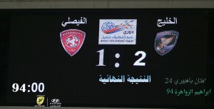 قاد الاردني ابراهيم الزواهرة فريق الخليج الأول لكرة القدم لفوز مثير على فريق الفيصلي بنتيجة 1/2 بعد تسجيله هدف قاتل في الثواني الاخيرة من اللقاء الذي جمع الفريقين مساء امس السبت ضمن منافسات الجولة 23 لدوري عبد اللطيف جميل السعودي للمحترفين . وكان الخليج تقدم بهدف هتان باهبري د 24 ليشهد الشوط الثاني احداث مثيرة بداية من طرد مدافع الخليج بوبا د 47 ثم مروراً بركلة الجزاء التي احتسبها الحكم عبد الرحمن السلطان في د 90 للفيصلي والتي سجلها بالبوا ولكن النهاية ختامها مسك لابناء الدانة عندما اطلق الزواهرة رصاصة الرحمة في الدقيقة 4+90. وبذلك يضمن الخليج حسابياً البقاء في دوري جميل بعدما رفع رصيده الى 32 نقطة بينما بقي الفيصلي في دائرة الخطر لتجمد رصيده على 26 نقطة .